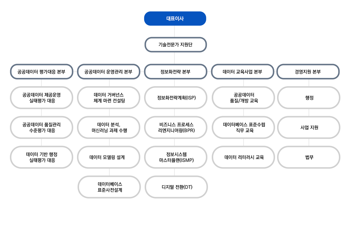 당사 조직도는 4개 사업 본부와 1개 지원 본부로 구성되어 있습니다. 사업 본부에는 당사의 주력 부문인 공공데이터 평가대응 본부를 필두로 공공데이터 운영관리 본부, 정보화전략 본부, 데이터 교육사업 본부가 있습니다. 또한 경영지원 본부, 기술전문가 지원단을 구성∙운영하고 있습니다.